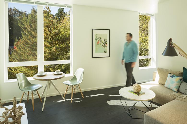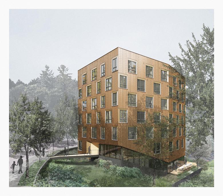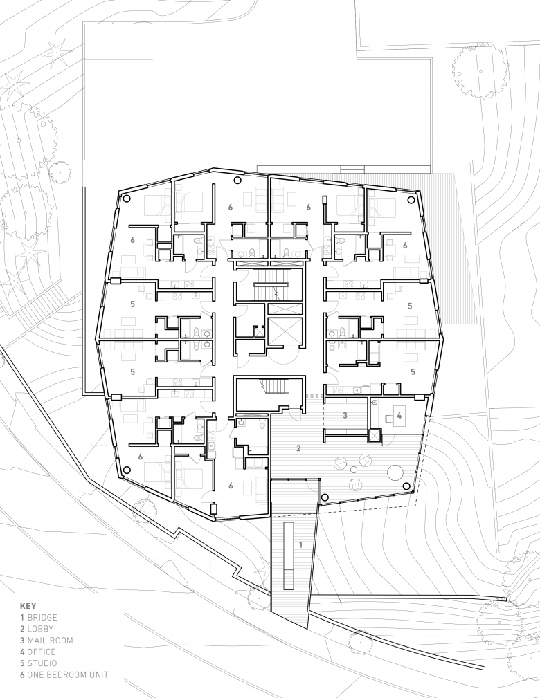 TreeHouse is a new mixed-use apartment building located on a steep and constricted site on the Oregon Health and Sciences University campus. The 7-story building is comprised of retail on the ground floor and 69 apartment living units above. Both retail and apartment units are intended to serve OHSU’s community of faculty, researchers, and students, as well as providing housing opportunities for the approximately 14,000 people who work in the Marquam Hill medical complex.
