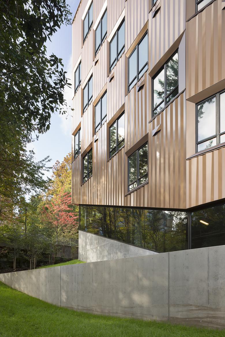 The design bridges the urban and topographical qualities of the campus by placing the building as an “in the round” object in the forest. Instead of cutting into the hill, the building form is carved to follow the landscape. From the interior entry lobby the experience of the forested landscape is framed. From the exterior, the building connects the upper level bridge entry to the lower level retail and rain garden landscape and deck that mitigates all storm water runoff.
