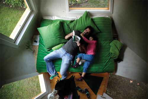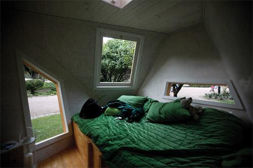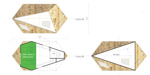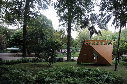 The Treehouse Hotel is literally a living capsule built in wood, with a strong formal image. It freely resembles an abstract space-ship with its oblique planes in an overall triangular tridimensional shape. Its interior space is unified as living room and bedroom with the inherent infra-structure. The envelope is then opened with individual windows that propose specific points of view to the surrounding garden strongly related to the corporal appropriation of the interior space. With Treehouse Hotel, dass present us an idea of living the contemporary city. Instead of a mere sequence of daily routines, urban life can also be composed of a series of peculiar moments of discovery that breaks the visual and perceptual blindness of repetition. In fact, strangeness and unpredictability can be another way of revitalizing our experience of the city, proposing new ways of seeing and feeling what one arrogantly thinks to know already. In this sense, Treehouse Hotel is truly a machine for intensifying urban life: "Rather than creating an exhibition or a seminar, the Treehouse Hotel offers the opportunity to create something beautiful, not only formal but to achieve the perfect combination between form and function, between man and his context, emphasizing the ephemeral character of Life, Nature and the City. The simplicity of the idea of creating a Treehouse that can be rent and lived becomes a message that in the event of the temporary Experimenta Design09 in Lisbon can become eternal."