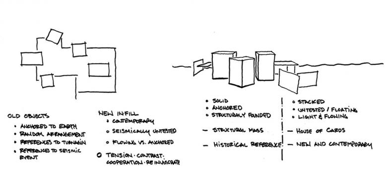 Their exteriors finished with new, contemporary materials, reflect new beginnings. These areas provide contrast to the traditional, structural elements by illustrating a lighter, almost floating quality. The contemporary areas are theoretically seismically untested; like a house of cards, they’re relying on anchors for stability and support.