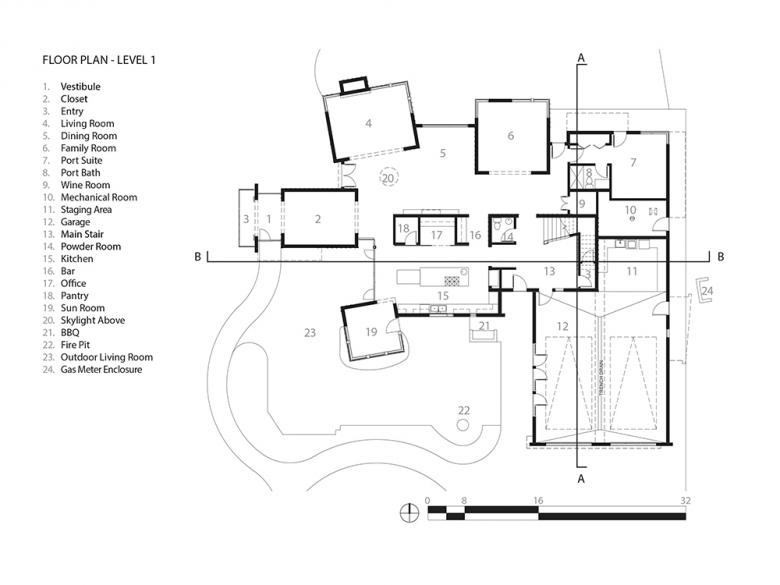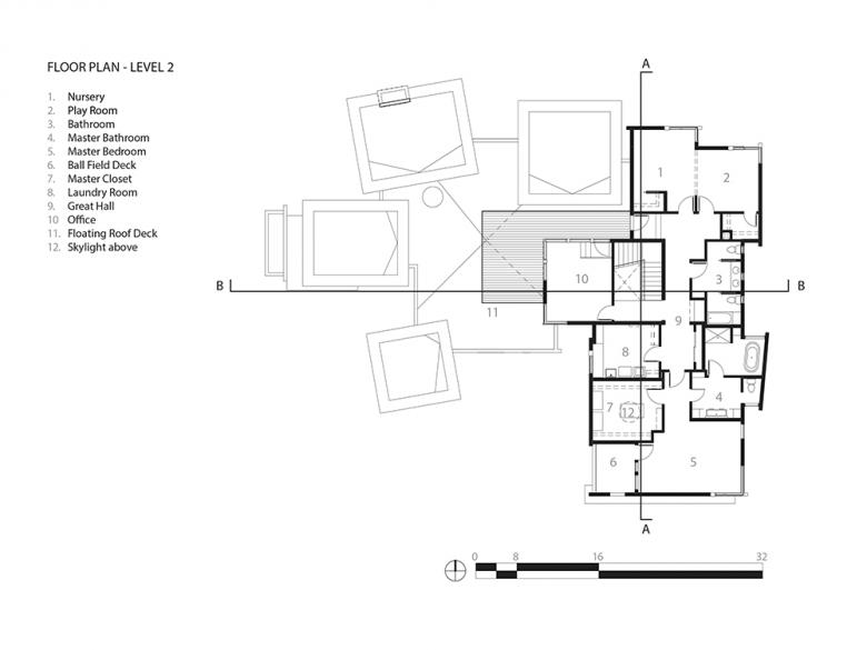 Five portions of this house were designed conceptually as “original structures” that “made it through the slide,” found as ruins sitting awry on the site. Using these sturdy survivors as anchors, their exteriors were finished with board and batten style siding and wood ceilings commonly found around the original neighborhood. The areas between these anchors were filled, creating the body of the house.