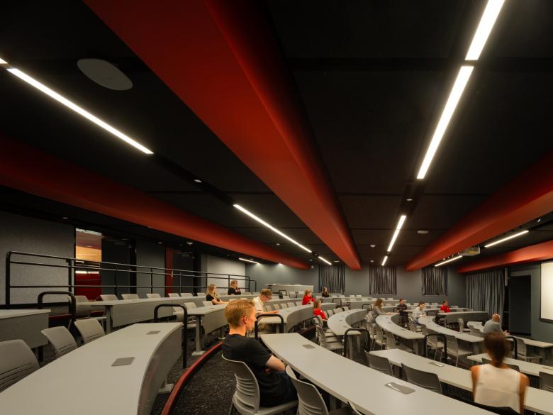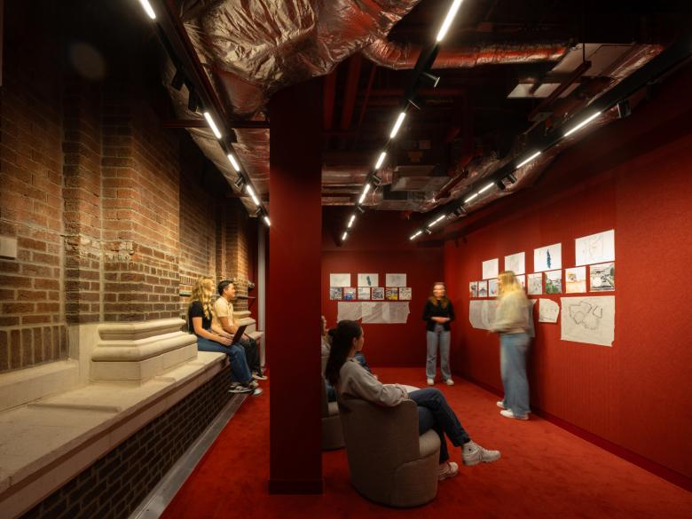 The new entrance serves as an exhibition space, replete with a flexible retractable wall (always used for pinups and reviews), as well as the primary entrance for the expanded auditorium.