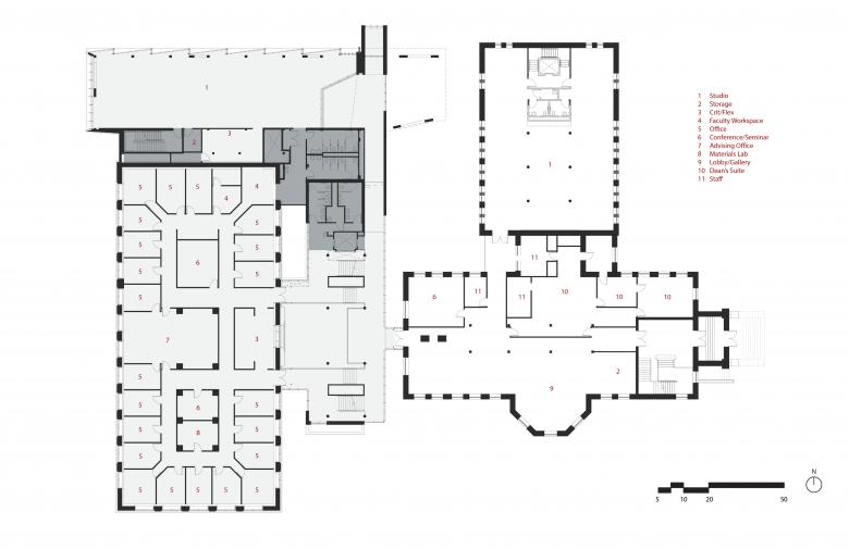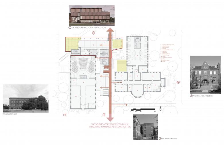 With an expanding student body, the University of Nebraska College of Architecture was at a crossroads. Needing to expand its facilities, it faced the prospect of either demolishing existing buildings, or alternatively adding onto a complex of three buildings that date back to the 19th Century. Architecture Hall was built in 1891, the Law College in 1921, and the “Link” Building was completed in 1985 providing the historic complex with elevators, fire stairs and a lobby. Despite its large footprint, the “Link” does little more; hence, the newly proposed addition strategically adopts this under-utilized infrastructure to preserve the integrity of this historic campus while offering maximum flexibility for added studio space, critique spaces, and the restoration of a historic auditorium. Since the existing buildings have varying elevation heights on each floor, the new studio space mediates between all discrepant levels.
