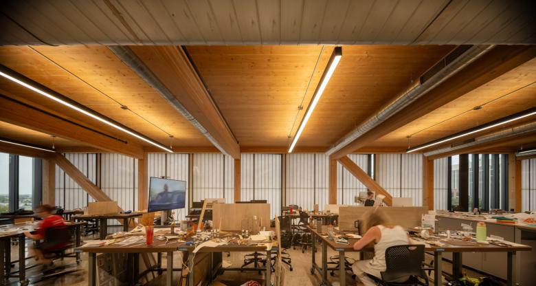 With the increase of construction cost due to supply chain reverberations of the post-Covid era, we have had to imagine ways of building that bring radical economies to construction protocols while ennobling the materials being used. Given the audiences of a school of architecture, erudite as they are as faculty and students, any new school of architecture is apt to serve as a pedagogical building: not only as spaces of learning, but in fact as a didactic instrument. These audiences learn from the inventions and failures of these buildings. The reduction of trades can lead to an enhanced use of craft within each material technology. In this instance, we adopted mass timber, not only as a naturally renewable resource, but as a technology that can be assembled with immense speed and substantial precision, reducing the carbon footprint of the building.