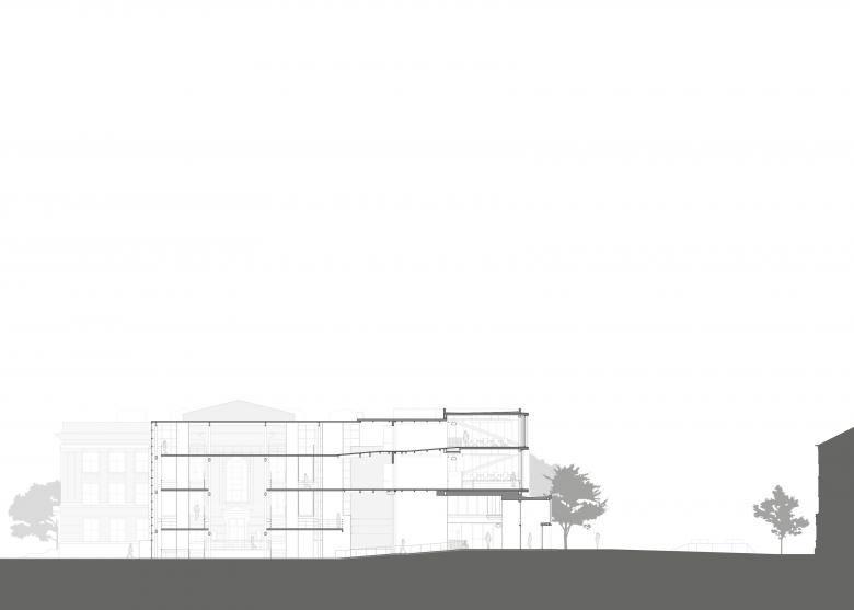 complex of buildings that have for years been entered through ancillary means. In turn, we are also able to link the four wings in an interconnected fashion such that all disciplines can seamlessly communicate with each other. Furthermore, they all come together framing a central courtyard, framing an outdoor classroom. The expansion also frames two open porticos as an expanded exhibition space.