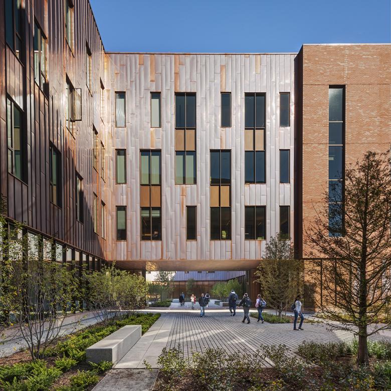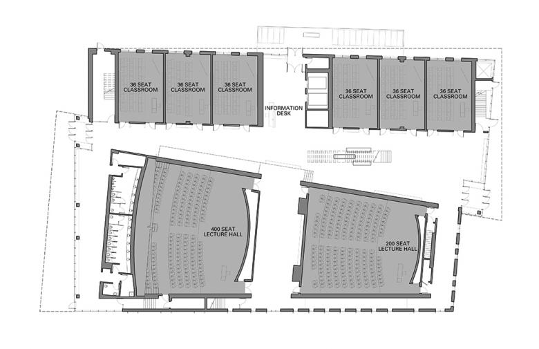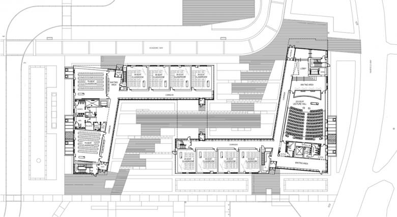 The academic program was separated into two buildings that together strengthen the center of the campus. Because each is still a large building, the scale was reduced by employing both brick and copper volumes. Ground level glazing increases visual permeability and offers views at student gathering and waiting areas. The shared use of these materials gives a resonance between the two buildings. The classroom-only building, Laurel Hall, is compact, framing an important student quadrangle; in contrast, the departmental / classroom building, Oak Hall, is serpentine, providing hundreds of windowed offices at the upper three levels, while creating two interconnected courtyards. Together, the designs support the campus master plan by clarifying important walkways, intensifying activity and density at the center of campus, and providing memorable new landscapes.