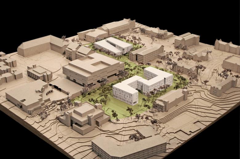 Site model with Oak Hall in the foreground and Laurel Hall in the distance