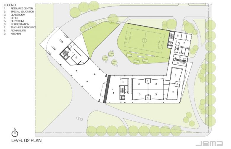 PROGRAM – The facility includes programmatic components typically associated with elementary schools, but also includes program spaces for improved student health and nutrition. The building includes training and exercise areas for the students. The building also contains program components that are specifically for community purposes. The multipurpose room includes space for community classes such as cosmetology for parents. The outdoor areas include community plazas, a community café, and community tables that encourage neighbors to play dominoes.