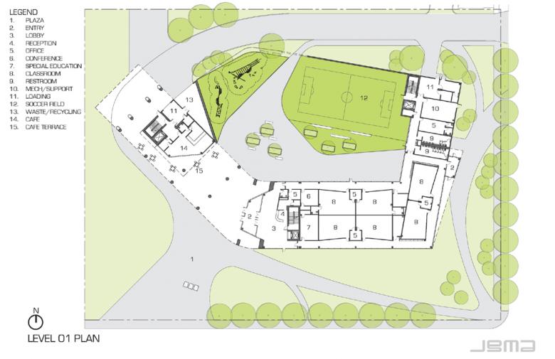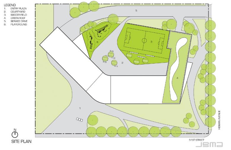 JGMA (cont'd): The design of the building itself is inspired in part by the educational development of the children it serves. Just as a child grows, the building appears to grow out of the ground, where programs such as learning theaters, administrative components, and classrooms frame a soccer field courtyard. Developmentally essential programs including a fitness center and resource library progress the movement of the building gradually upward. Finally, the building culminates in a community center that frames views of the Chicago skyline, inspiring students and neighboring residents to achieve their potential.