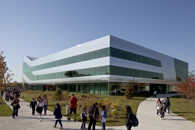 This highly innovative design turns a conventional elementary school inside out. By locating the corridors along the largely glass perimeter of the building while simultaneously locating a full-height glass wall along the interior classrooms, the school is able to dramatically increase daylight and views inside the classrooms. Natural light is therefore allowed to fully penetrate the spaces, creating an effective and efficient teaching and learning environment. This arrangement allows for the additional benefits of increased teaching surfaces in the classrooms, as well as a heightened sense of community connectivity whereby student activity within the corridors is showcased along the building’s exterior.