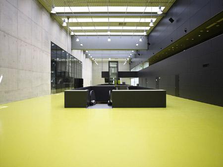 Innen ist sie denkbar roh und abgedunkelt. Asphaltböden und Sichtbetonwände vermitteln Sparsamkeit. Auch die neben den vier vorspringenden Liftschächten allenfalls als Gliederung lesbare Mittelstützenreihe steht nur aus Kostengründen bzw. um die erforderliche Spannweite der Dachkonstruktion (auf 33 m) zu halbieren. In die passend zum Beton grau gestrichenen Brettsperrholzbalken des Trägersystems im Obergeschoß bzw. in die entsprechenden Unterzüge aus Stahlbeton im Erdgeschoß sind Führungsschienen eingelassen, an welchen mobile, den weiten Raum bedarfsweise segmentierende Trennwände geführt werden können, die sonst hinter den tragenden Stahlbetonwänden geparkt sind.