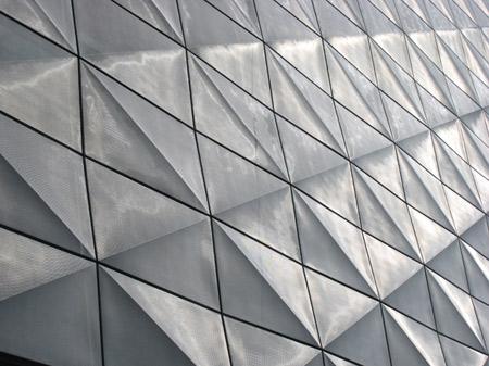 Außen schließt die doppelwandige Halle direkt an Diskurse an, die sich aus dem Wechselspiel von Funktionalität und Stil ergeben, seit sich die Architektur eines ihr stets inhärenten Problems bewusst ist: Soll sie zeigen, wie sie funktioniert, oder sich schmückend verkleiden. Eiffelturm und Freiheitsstatue sind nicht nur Wahrzeichen der sie beheimatenden Städte, sondern bezeichnen symbolisch auch treffend beide Pole. Die Grazer Messehalle liegt genau dazwischen. Um die zweigeschoßige Halle läuft außen zwar eine Funktionszone für Technik, Fluchtstiegen, Reinigungsgänge. Deren Sichtbarkeit bleibt auch prinzipiell gewährleistet, wird aber minimiert, weil hinter einer Haut aus dicht gewebten Streckmetallfeldern verborgen. Unverstellt wären die Glasfassaden der Foyers zu sehr in Konkurrenz zu jenen der Stadthalle getreten. Das Licht absorbierende, dunkelgraue Stahlkleid wirkt weit dezenter. So dezent, dass es nächtens nur durch am Dach auskragende Leuchten überhaupt sichtbar bleibt. Und das Kleid wirft außerdem leise Falten. Um seine Widerstandsfähigkeit bzw. Steifigkeit zu optimieren, musste jedes seiner Felder diagonal gekantet werden, was die Monotonie der fensterlosen Außenhülle lockert und gewissermaßen ornamental bereichert. (…)
