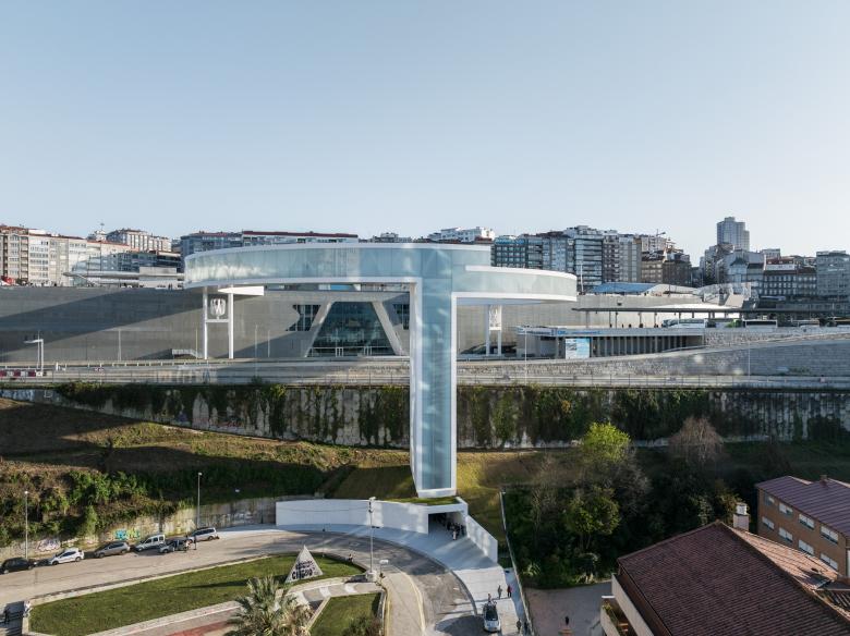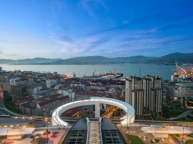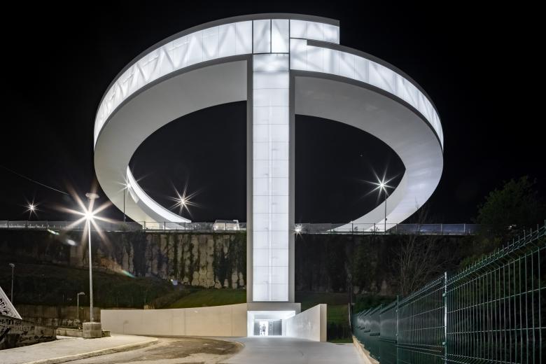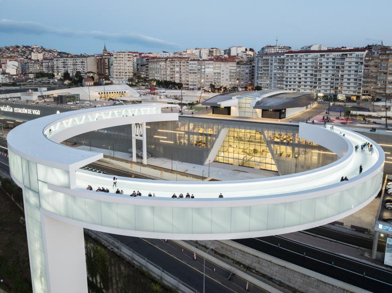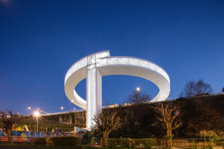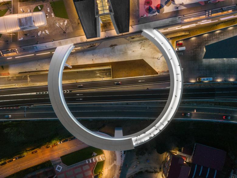 The new structure resolves a vertical level difference of more than 40 meters (131 feet), connecting the Vialia Vigo Intermodal Station, designed by Morphosis, with the García Barbón area. It consists of an elevator tower and a circular pedestrian bridge with a diameter of more than 80 m (262 ft) that rises above a busy six-lane highway. All of this is supported at only three points: One corresponds to the elevator tower itself, the other two supports include two vertical wind turbines of 3.1 m (10 ft) in diameter, which serve to generate electrical power for the elevators.