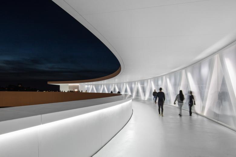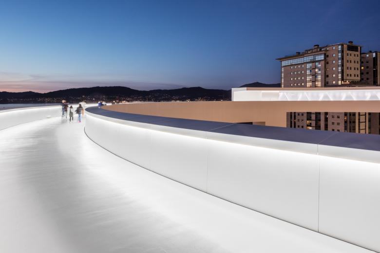 The circular bridge, with a width of 4.5 m (14-1/2 ft), allows for a panoramic walkway that opens onto the landscape of the Vigo estuaries. One side of the bridge is equipped with a roof that offers protection against inclement weather, while the opposite side remains open, allowing unobstructed views. The structure is composed of a spatial truss clad with white solid surface panels and glass. The external faces of the pedestrian bridges and the elevator tower are covered with laminated tempered structural glass supported on only two edges, without intermediate joinery or supports. The glass has a subtle white ceramic silkscreen that allows views from the interior but conveys the structure with its milky color and allows nighttime lighting to illuminate the glass facade like a beacon over the city.
