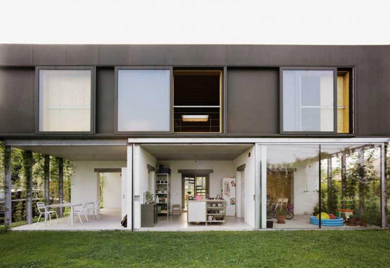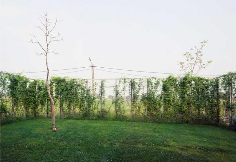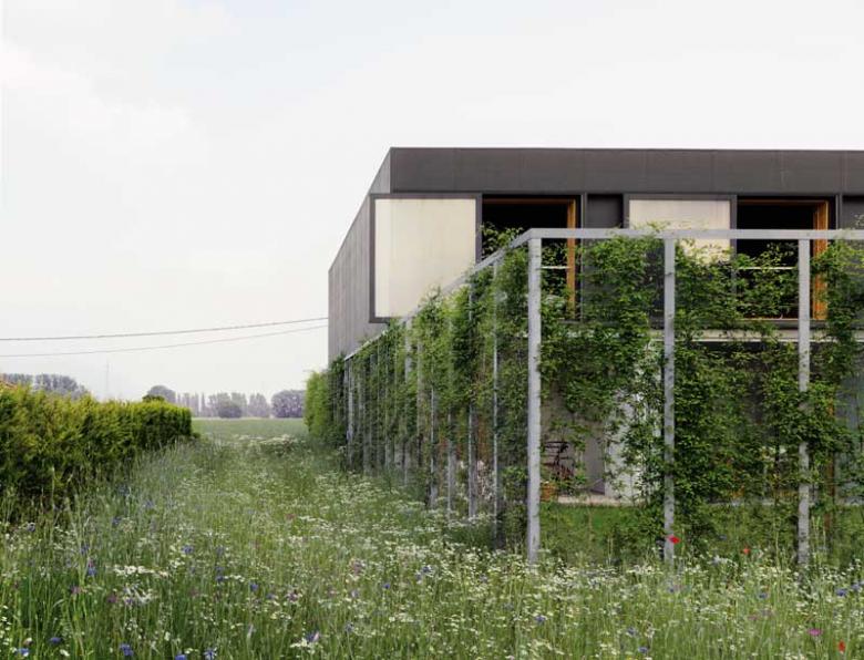 This freestanding dwelling is situated in the middle of a plot between woods and an agricultural area near the village of Buggenhout. The enclosure—a modular steel fence—is an integral part of the design and defi nes the volume of the house. The surrounding unkempt garden is not included, and functions as vehicular access around the house. The dwelling itself is composed of two levels: an open “outside house” on the ground floor, and a closed “inside house” on the first floor, with views of the woods and rural landscape.