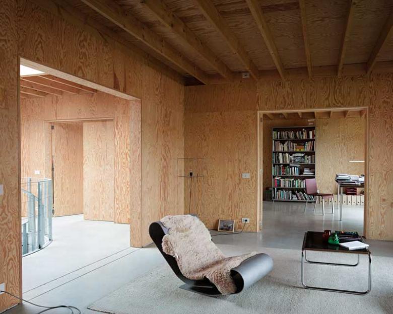 The outside house is conceived as a patio villa with a garden. Its thick double walls—two load-bearing layers of standard brick, painted white—carry a concrete platform that forms the base for the inside house. The inside house is a compact set of rooms in the depth of the roof of the patio villa. This is conceived as a wooden box that covers the platform, which is made watertight by covering it completely with a dark plastic membrane. All detailing on this project is designed from the inside out: the huge sliding windows are added to the façade in such a way that the frames are invisible and do not impose on the impressive views. These are directed at the still open, rural landscape, while the neighbouring houses remain relatively invisible. By deliberately moving the fence in from the edges of the property line, the dwelling becomes actually “freestanding”—a rare luxury in carefully demarcated Belgium.