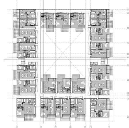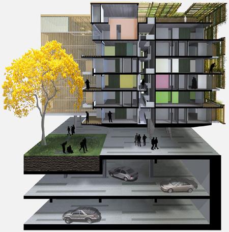 The apartments are developed on five different levels: some of them looking onto the lateral streets, and others onto the interior void of the building, where the plaza is located. In order to generate greater intimacy, the interior circulations which give onto the plaza are lined with a sort of latticework. The exterior façades, of prefabricated concrete, are enlivened by a series of individual gardens that personalize the apartments. On the upper floors, the apartments are of two levels. A rooftop garden with vine bowers generates open space and offers ample vistas of the surroundings.