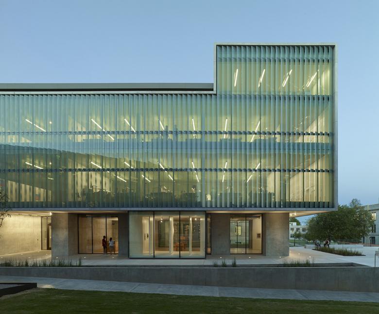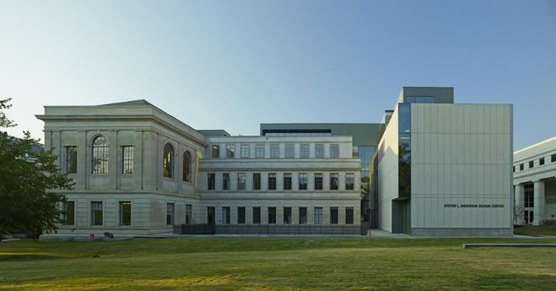 Similarly, regulating lines established by the classical composition and rigorous proportions of string courses, cornice lines, traditional fenestration and moldings of Vol Walker Hall generated the organizational system for articulating and sizing the Indiana limestone panels that clad the north and south walls of the Anderson Design Center and the sleek fritted-glass panes, designed to ameliorate the harshness and heat of western light, that comprise its curtain wall. A visual sliver of glass in the north and south elevations, the transparent wells of its new fire-stairs, creates a respectful seam that negotiates the addition and the original structure from the exterior, yet, from the interior, frames and underscores the carefully calculated relationships between the two. Meticulously fabricated architectural concrete, together with the contextually fitting stone cladding, vest the addition with a gravitas, a feeling of weight and substance that honors its historic counterpart.