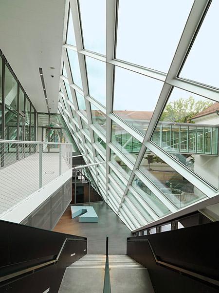 Auch das darauf bauende Konzept des neuen Südflügels ist denkbar einfach angelegt. Der Neubau hat drei Bereiche: den vom historischen Bestand geprägten Unterbau, die „neutrale" Verteilerzone der Eingangsebene und das von zeitgenössischer Technik erzählende Obergeschoß.