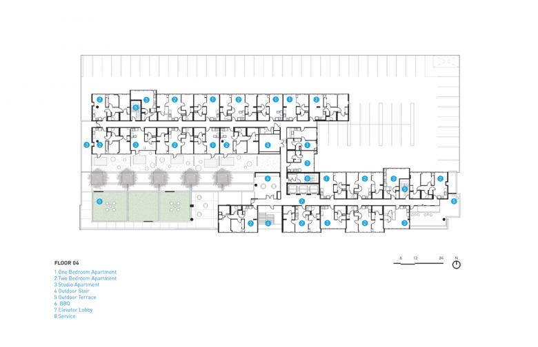 As measures to combat urban sprawl, the developmental density is kept at a minimum of 60,000 square feet per acre and is within near proximity of alternative transportation options. Residents have access to local bus routes at the edge of the block, a commuter train line a half mile away, and are provided with extensive bike storage within the parking garage.