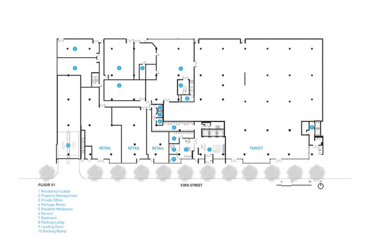 "Just two blocks north of the University of Chicago’s urban campus and less than a mile from Lake Michigan, Vue53 sits in the heart of Hyde Park’s commercial corridor. 53rd Street was once the retail center of Hyde Park, lined with an eclectic mix of buildings, typically three to four stories, but also included 8 to 10 story buildings, with the Hyde Park Bank Building reaching the same height as Vue53. At 13 stories tall, Vue53’s blue glass exterior and rectilinear, concrete frame is expresses rebirth of 53rd street as a retail and entertainment destination.