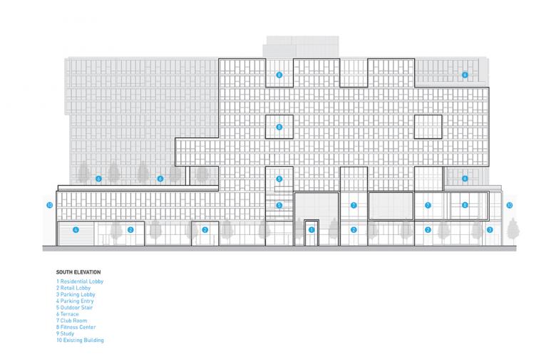 "The mass of the building is divided into two towers. The south tower is on 53rd street, deliberate voids in the elevation minimizes the structure’s perceived mass while framing views of Nichol’s Park, just across the street. The north tower is set 100’ back from the street to minimize its mass. Vue53 is able to accommodate its complex programmatic needs while remaining within the bounds by the precedents of its eclectic context."