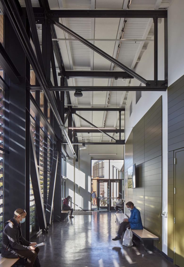 New exterior details—steel sunshades, cylindrical daylight collectors, a sculptural steel stair, and geometrically folded shade canopies—speak to the industrial past of the building. Walker Hall received a combined deep-energy and seismic retrofit, with new energy-efficient building systems and envelope upgrades. These improvements have extended the life of the structure for another 100 years, radically reducing energy use and operational carbon emissions. Actual energy performance in the first year of full occupancy has been 80% below baseline including renewable energy contributed by an on-campus solar farm. New thermal insulation and high-efficiency building systems, combined with dedicated renewable energy provided by an on-campus solar farm will result in a zero net electricity building.