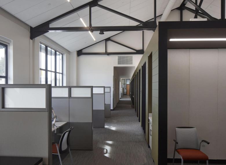 The design is anchored in the unique characteristics of its place — its rich academic history and hot, dry climate — welcoming a diverse student body at the core of campus life. The design team worked carefully to preserve as much of the existing concrete, steel, and wood structure as possible, reducing carbon emissions and celebrating the agricultural engineering legacy of the building and the university. Existing steel trusses, concrete columns, and finishes are retained and celebrated. High-performance modern facades are inserted within the original shells of the shop wings, expressing new academic uses to a revitalized campus promenade. Interior learning spaces open to the promenade through shaded windows that display academic life within during the day and glow like giant lanterns after dark.