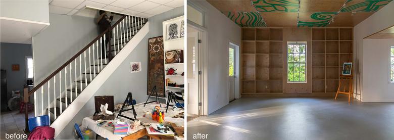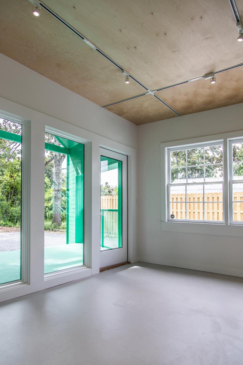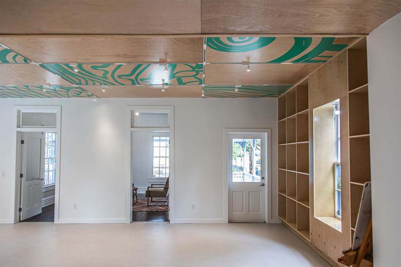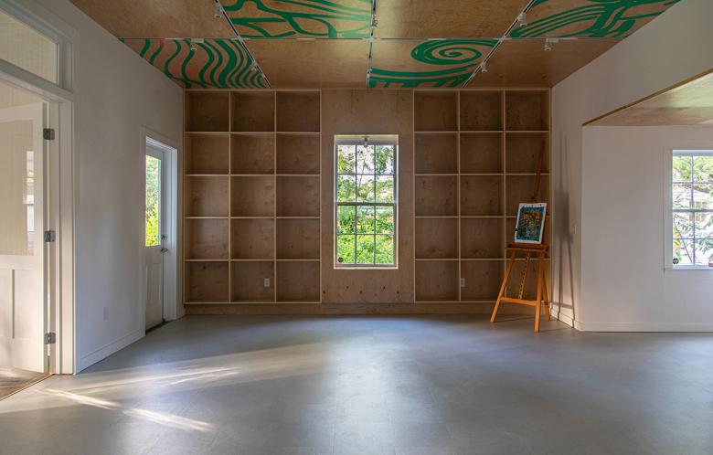 The museum’s request was to show a progression through time — past to present — from the historic street elevation, through the interior, to the new porch. With this in mind, the front gallery was restored to its original layout with beadboard walls and ceiling, tongue and groove floors, and two doors leading into the main studio. The main studio that follows is an open workspace that pays homage to Anderson’s block prints via graphics on the ceiling. This space is used for classes, meetings, and exhibitions. Towards the rear of the cottage, there is a smaller studio — formerly a storage room — with windows overlooking a porch that appears to be exploding into the landscape. The porch, and its amphitheater stairs, provide space for outdoor classes, lectures, and concerts. It sets the tone for the second phase of the campus expansion. The teal color used throughout was derived from Walter Anderson’s boat.