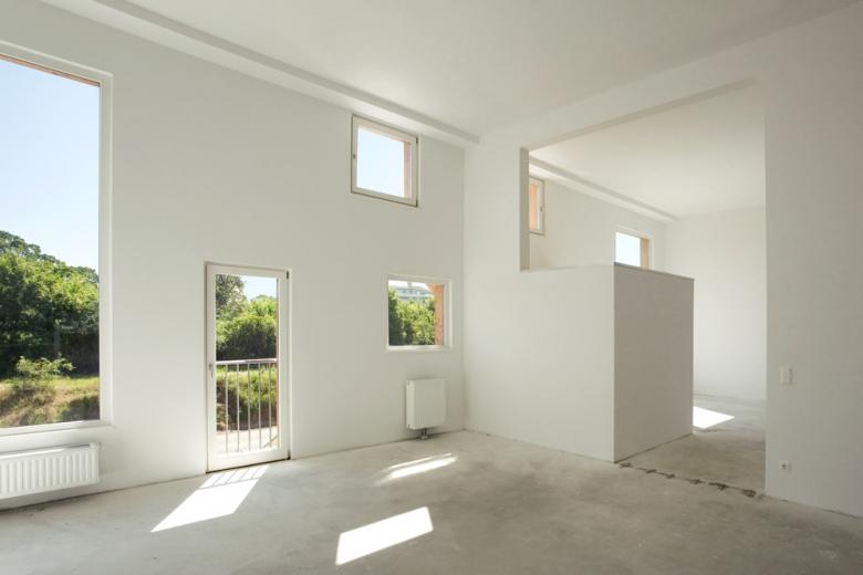 Raumplan reloaded: 4,10 m hoher Wohnraum in Czech-Häusern, horizontal teilbar durch die Galerie