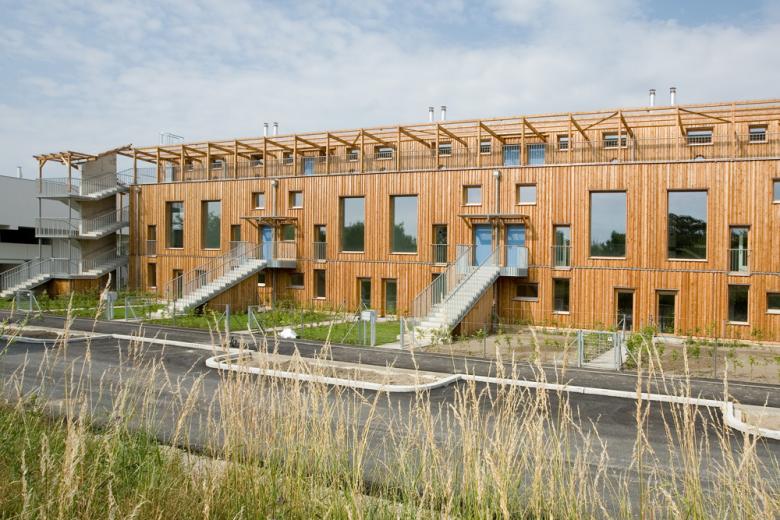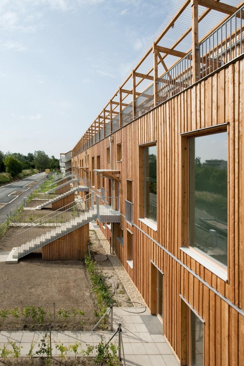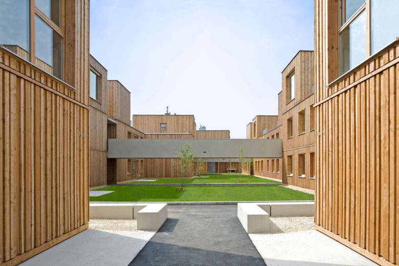 Das Holz gibt der Anlage einen spezifischen Charakter und macht sie als zusammenhängendes Ganzes erkenn- und erlebbar. Der lebendige und alternde Rohstoff passt wunderbar zum Generationenwohnen, dem Naturschutzgebiet und der grünen Umgebung. Außerdem verbindet das Holz die unterschiedlichen Handschriften. (…)