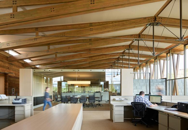 Washington Fruit & Produce Co. is a 16,500-square-foot office building with twelve private offices, two conference rooms, open workspace for 50-60 employees, and a lunch room with seating for 30; all of which have views out to the adjacent curated landscape and hills beyond.