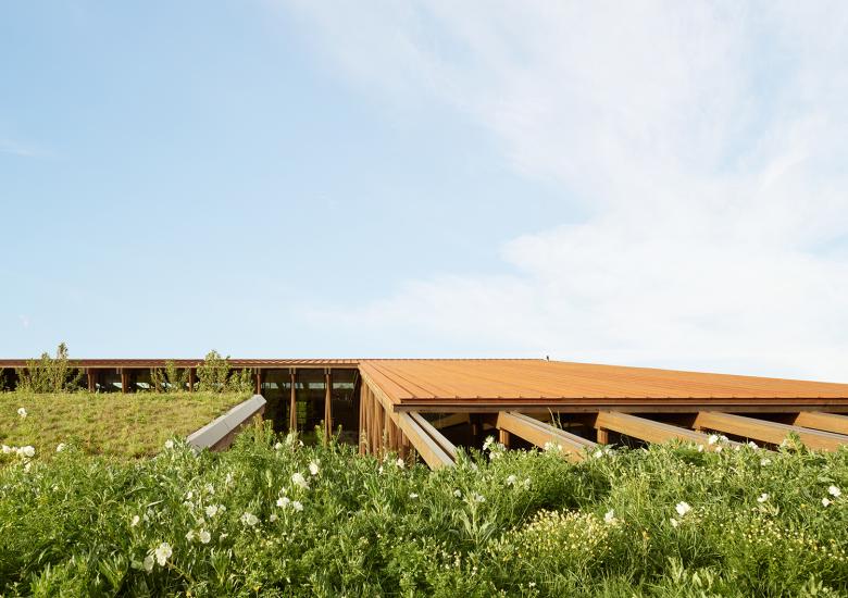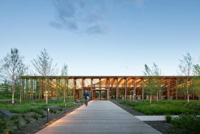 The use of locally sourced pre-fabricated SIPS panels and glulam structure allowed for fast construction of the superstructure with minimal waste. Sixteen thousand square feet of locally reclaimed barnwood was used on both the interior and exterior of the building, contributing largely to the warm and sustainable material palette. The design also allowed for minimal cut and fill, as the soil removed during excavation was used in the design of the berms; a strategy that also allowed the lunch room to be buried, naturally insulating the roof.