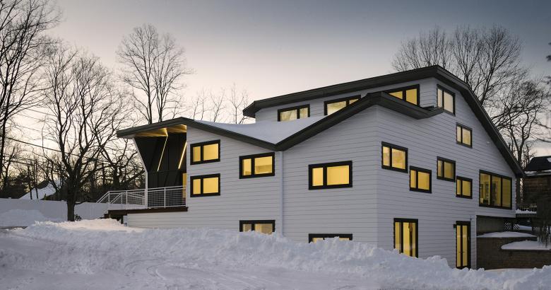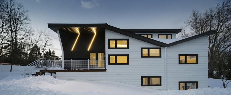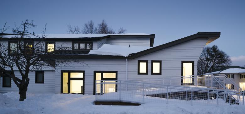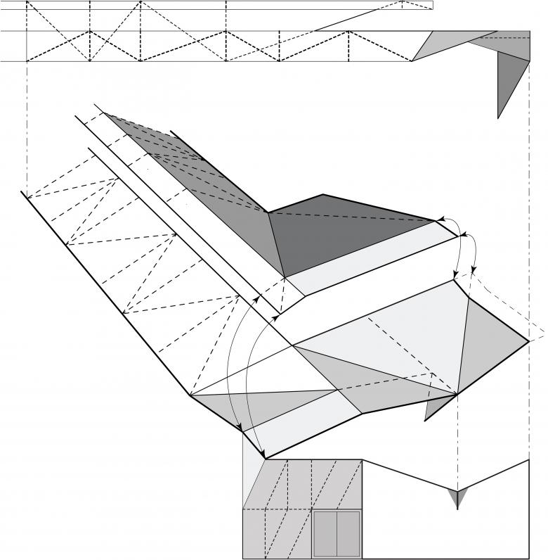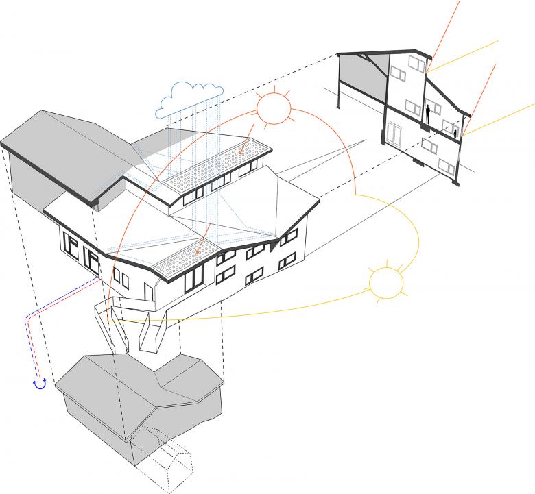 A sustainable structure is provided by a series of pedagogical legible passive energy and water harvesting methods as well as a geothermal system. Moreover, the roofline – besides its enunciated role in the harvesting of solar energy and water – integrates a previous attached 1950 pitch roof structure.