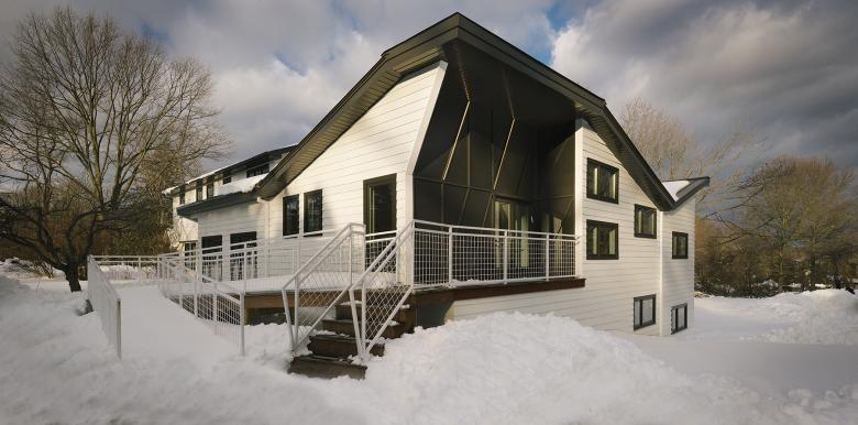 Materials: Standing seam enamel metal roof, recycled fiber cement panels, Steel and wood insulated windows, certified harvested wood floors, 2 by 6 balloon frame construction.
