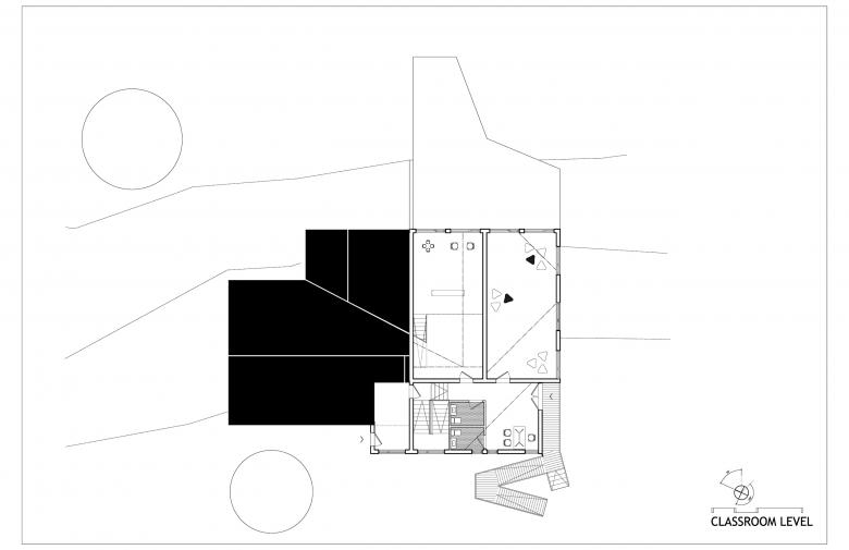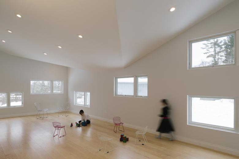 To enhance pedagogical focus on active and exploratory space, we designed a series of focus relations to the outdoors and more importantly, spatial variety as implemented by the fenestration and roof lines. As an example, the alternating height window envelope defines child and adult spaces as well as it integrates the sectional shift of the program and topography.