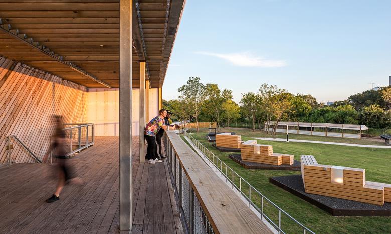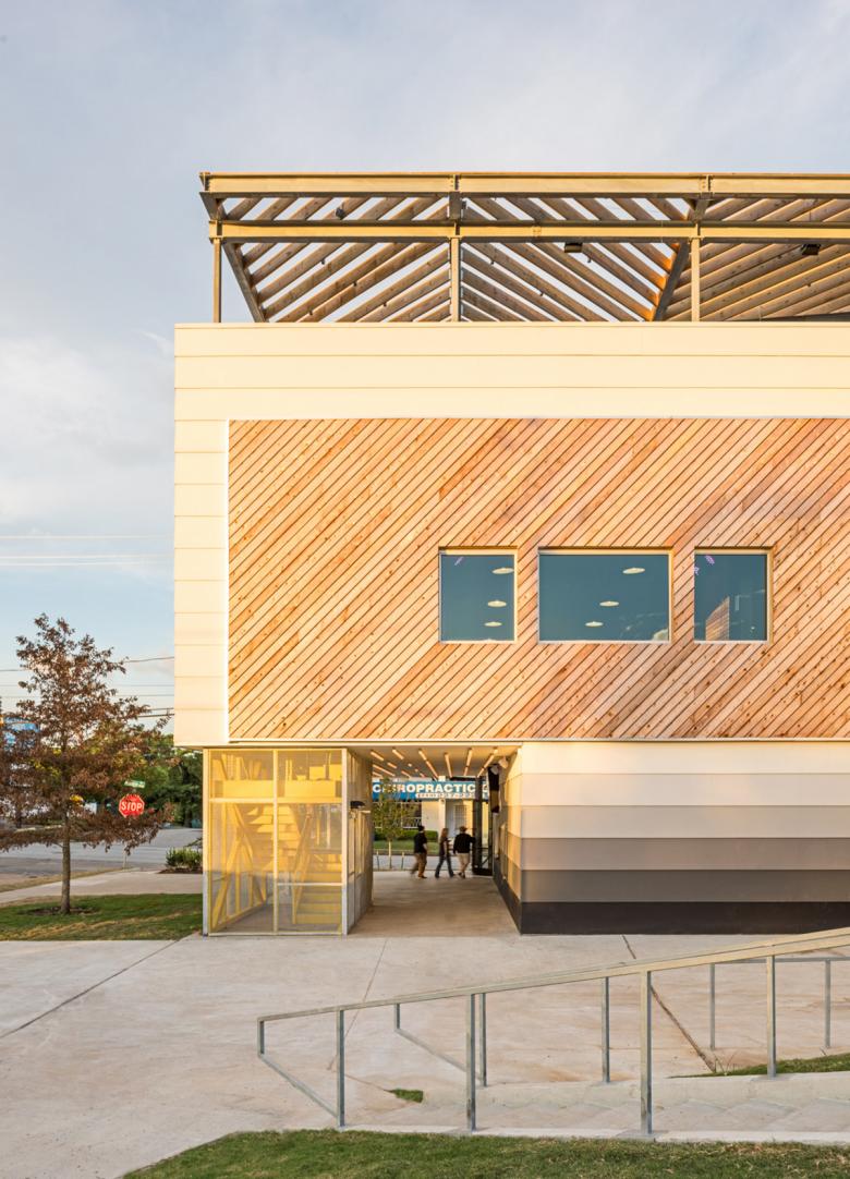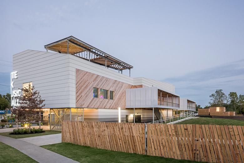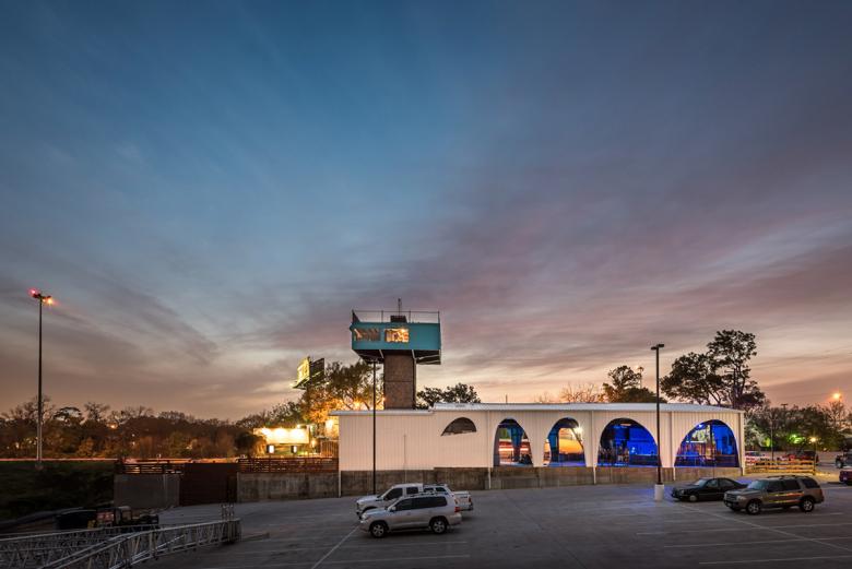 Mostly because of the lighting requirements for the indoor venue, the main building has few windows. The Raven Tower Pavilion was an existing shed that we sliced open and made into an open-air structure that needs no mechanical systems. The selection of the site was influenced by the location of the recently expanded light rail system in Houston, to build off of the growing public transit system in a city historically defined by the automobile.