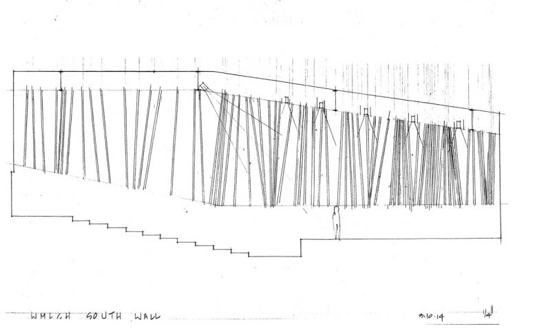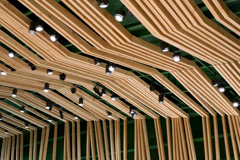 The interior of the hall gets its nickname “Hall of Trees” from the 4” x 8” ribs that arch up the sides and across the ceiling. They are slightly offset to evoke a forest of trees and to scatter the sound and create cleaner acoustics for the performers.