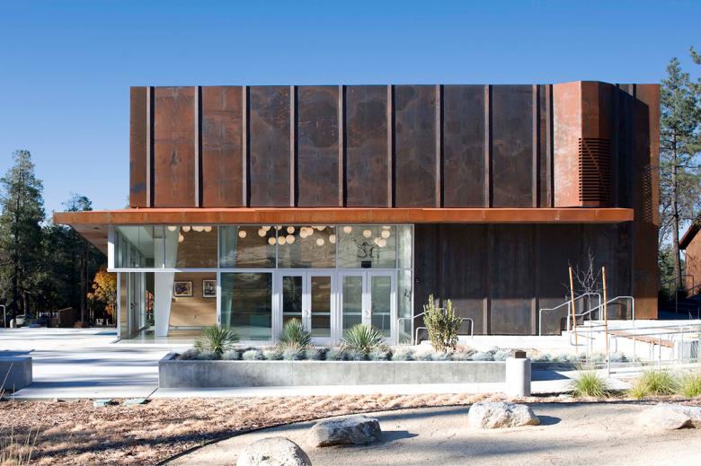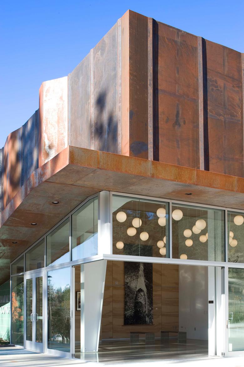 PEMB structural frames can be used in any size building, and are extremely economical and ecological. Folded Cor-ten panels are custom for this project, readily available, and can be shaped to our specific designs.