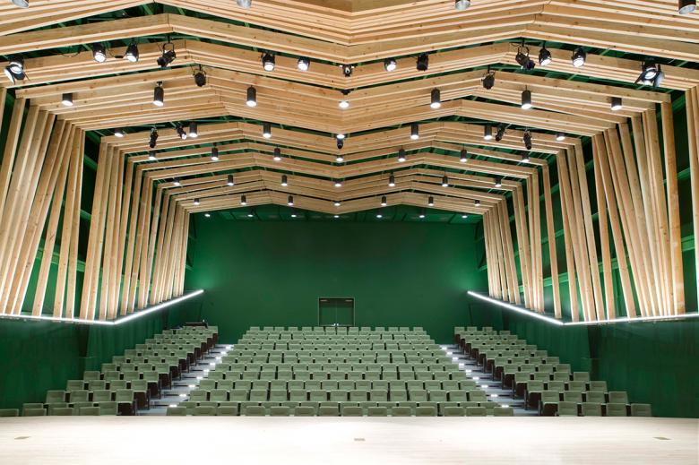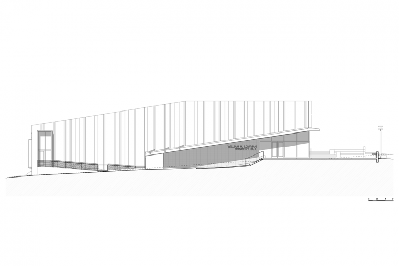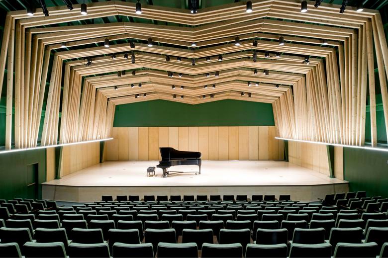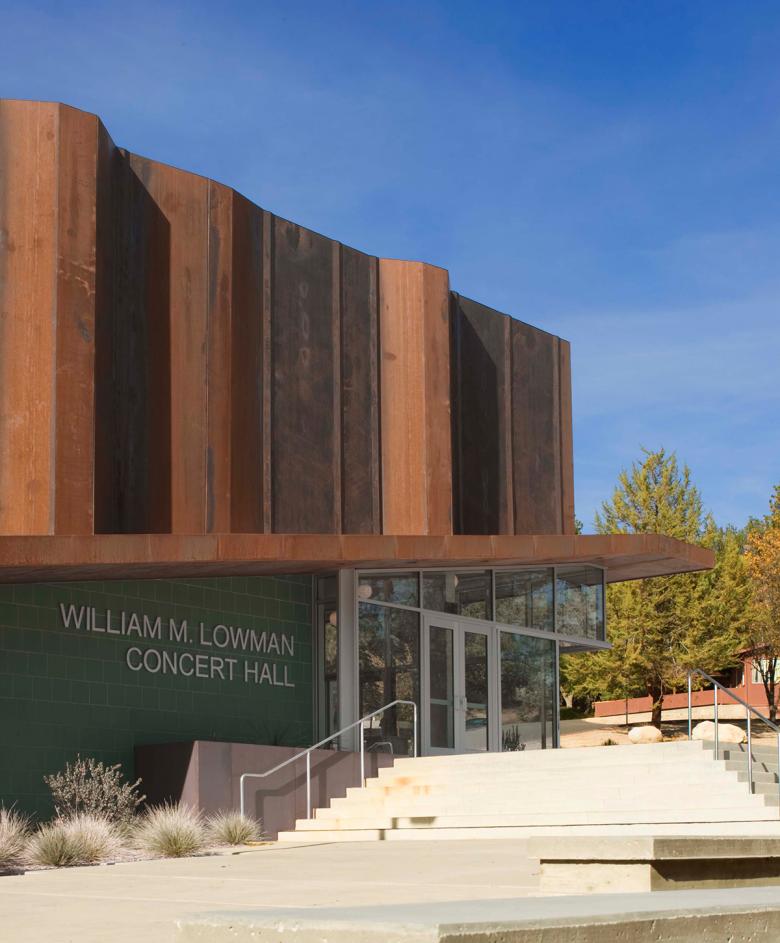 The Concert Hall is sheathed in rusted Cor-ten panels. The panels have an irregular topography derived from an abstracted musical phrase by composer Richard James, also known as Aphex Twin. This skin alludes to the music within the hall and to the landscape of folded rock and granite that makes up the surrounding mountains.