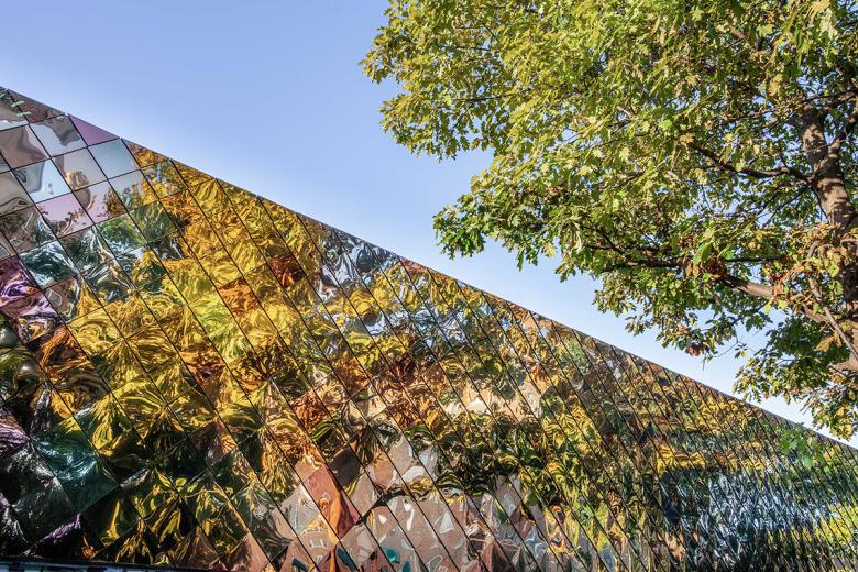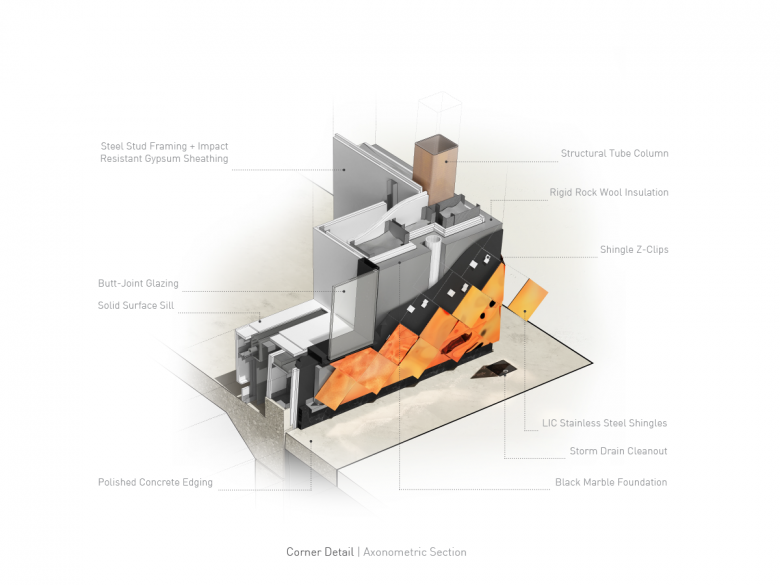 Although the project was conceived as a metal-clad building, the specific application of iridescent steel shingles was the result of intensive material research. The design team evaluated bronze, aluminum, titanium, and eventually settled on steel as the final expression. Similarly, multiple exterior wall systems were evaluated ranging from insulated steel metal panels to perforated and solid clad steel shingles or various size and configurations. The final rhomboidal vertical pattern allowed us to separate the expression of the building geometry from a particular modulation, utilizing the concept of a continuous skin to emphasize a single volumetric expression.