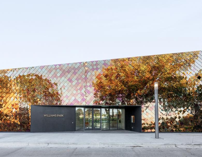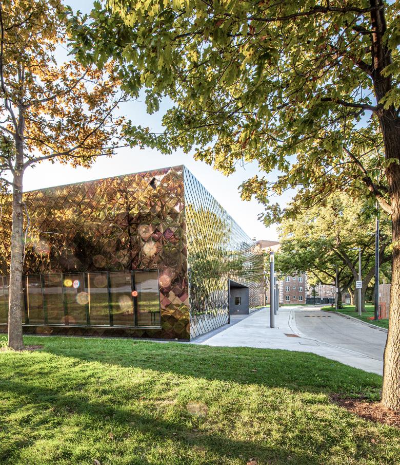 The new Williams Park Fieldhouse is the first building in Chicago to be fully clad in vibrant, iridescent stainless steel following a dragon scale pattern. The metal shingles create a chameleon-like effect, imparting multiple chromatic and reflective expressions which fluctuate throughout the day and across the seasons. This unique exterior expression enhances the visibility of the building solidifying the fieldhouse as a referential anchor within the community.
