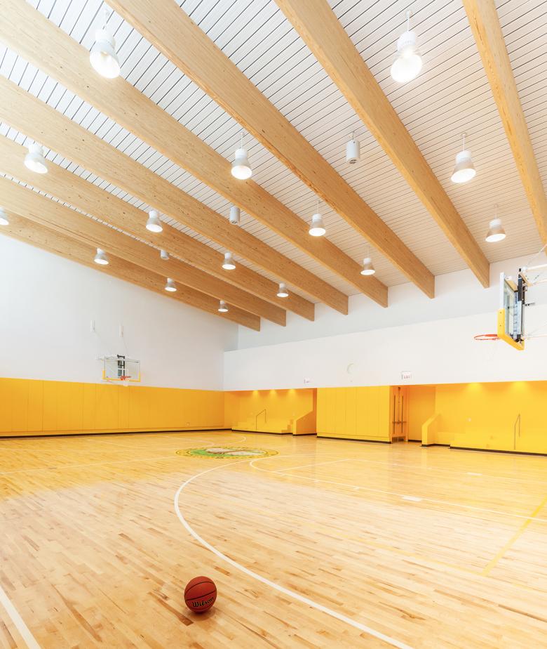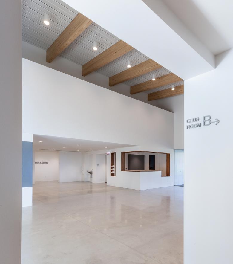 The building’s interior combines durable materials such as polished concrete floors and composite acrylic polymers with exposed large span glulam beams to create an environment that is both resilient and welcoming.