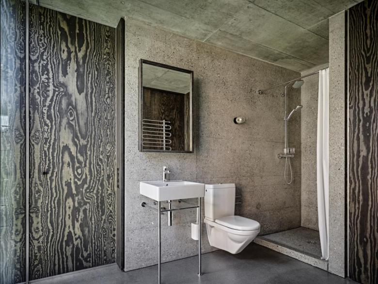 The bathroom is separated by furniture fronts. The cement rear wall has been sanded so that the grain is visible. (Photo: Roger Frei)