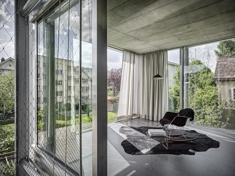 Bay window room with a view of the inner courtyard and ceiling-to-floor nets as fall protection in front of the sliding windows. (Photo: Roger Frei)