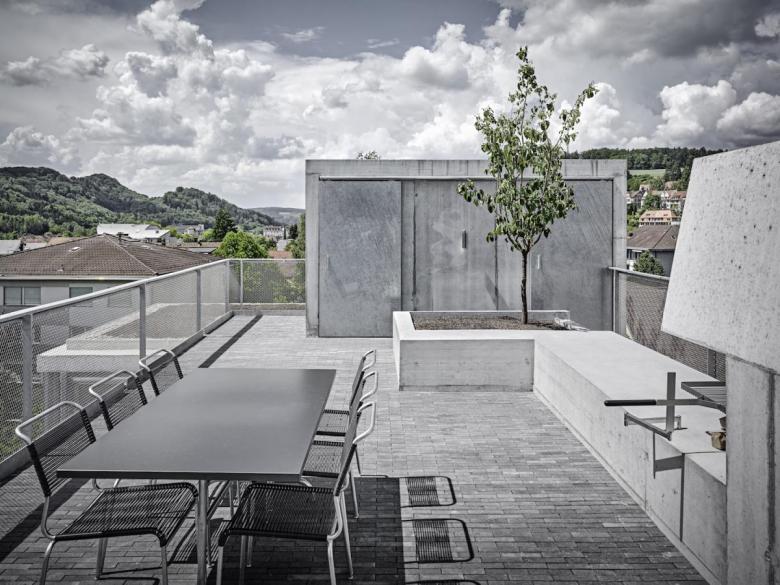 Roof terrace with fireplace and quince tree accessible to all residents. (Photo: Roger Frei)