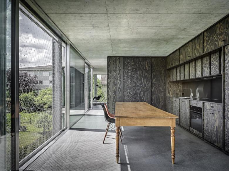 The view from the living area of the kitchen units made of black, oiled plywood in maritime pine. (Photo: Roger Frei)