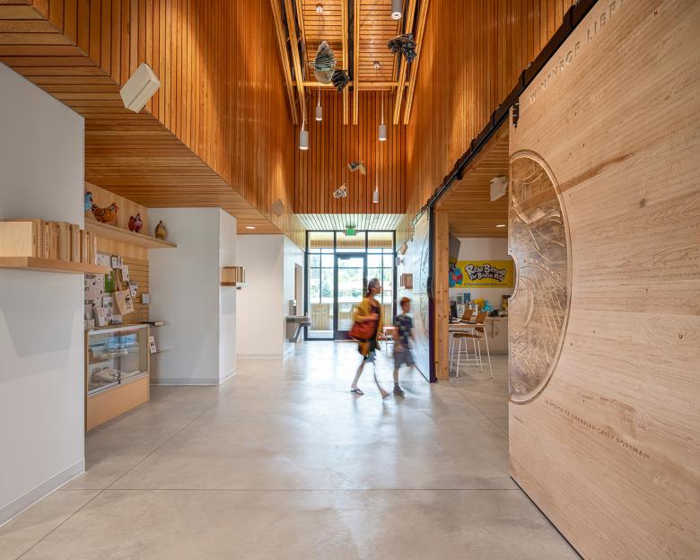 Inspired by the open-air agrarian buildings in the region, the design includes broad overhangs, open roof trusses, and visible structure. Hay barns, with their wide, sheltering roofs and airy side walls, proved a perfect model for the building. The hay barn’s structural elements are elegant and exposed, usually composed of trusses and braces that give a delicate, yet strong impression. The hay barn form is historic, authentic, and practical — all qualities that were perfect for the new Winthrop Library.