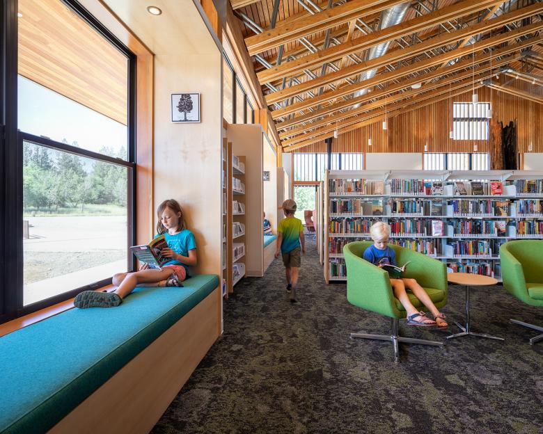 Natural and wildlife-inspired design elements were also brought into the space, creating an immersive experience for patrons of all ages, including a sculptural “learning tree” made by a local artist that provides an interior niche. Designed by Johnston Architects, a unique, fabricated plywood-clad “cube” in the children’s area has a custom-designed animal motif, which contains activity desks and built-in reading cubbies to complete the whimsical design – and camouflage a children’s restroom. A cozy fireplace beckons patrons from the front door to the far end of the space, where large windows frame the unique Methow Valley landscape.
