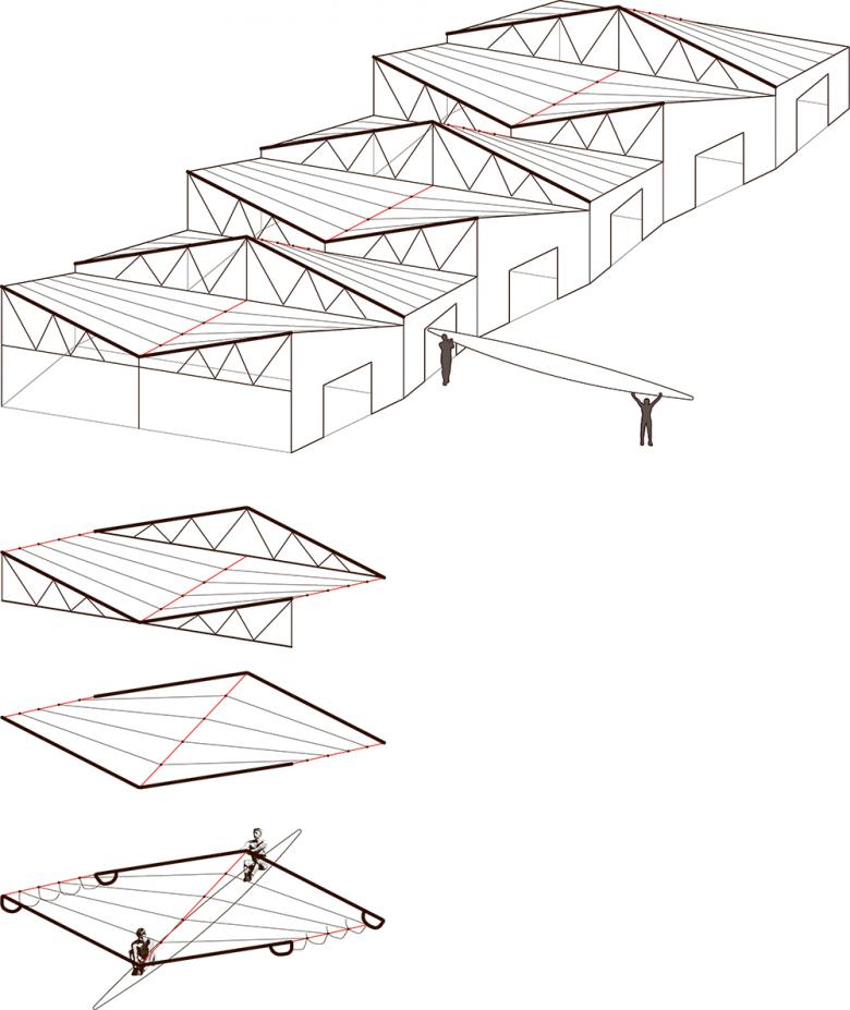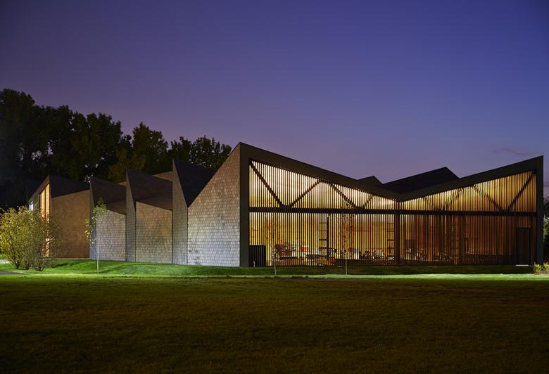 The trusses of the building are derived from the translation of the motion of sculling. Repetitive geometry and prefabrication are used to speed construction and reduce site disturbance.